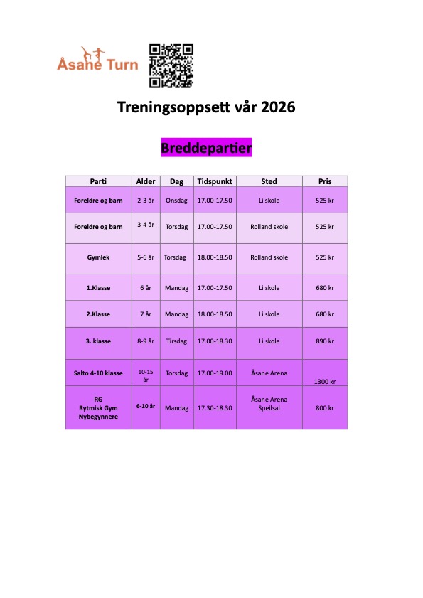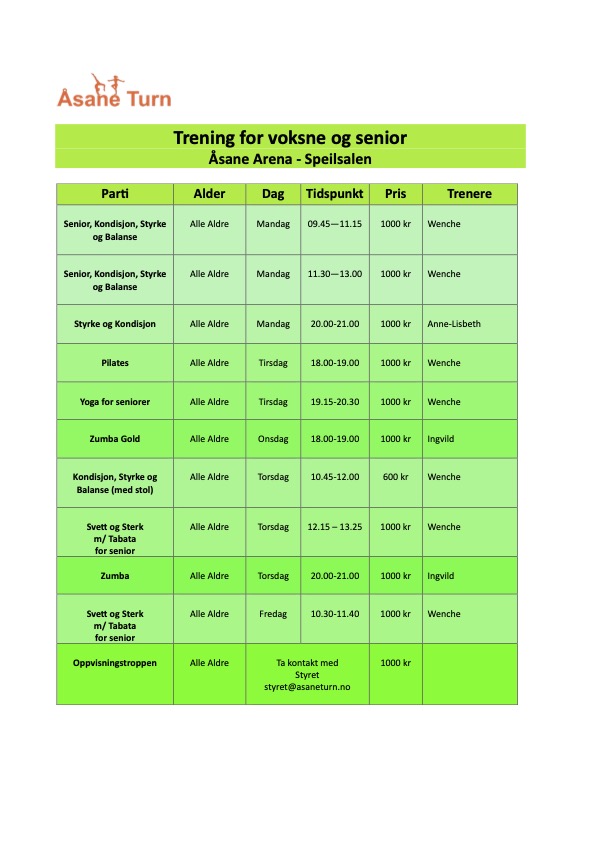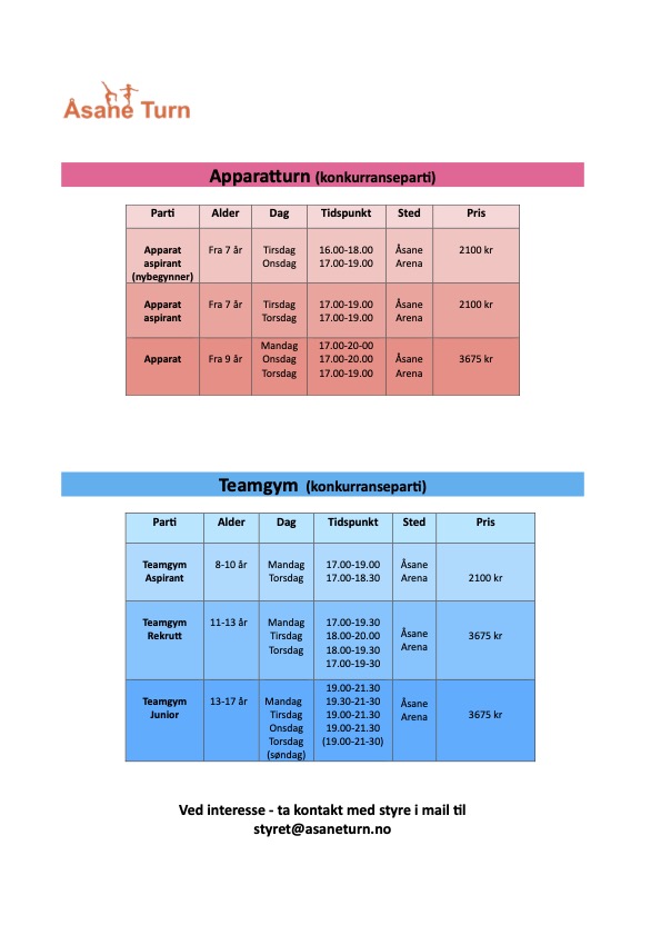 Alle parti starter ny sesong i uke 2. Gymnaster som har plass og nylig fått tildelt plass møter til oppsatt tid (se opplysninger i treningsoppsett). Vi har stor pågang, det er mange fulle parti nå og vi forsøker å finne en løsning for de som ikke har fått bekreftet plass til å starte på ulike parti.